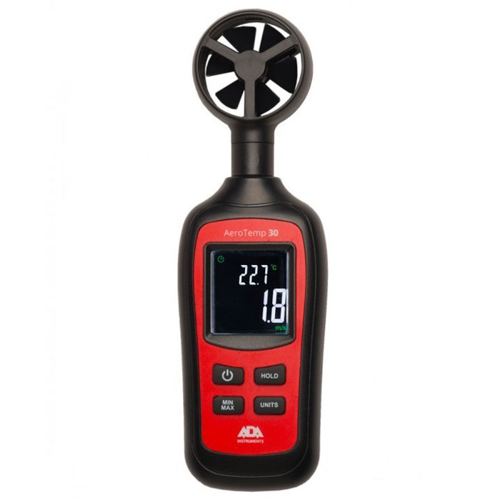 Das ADA AeroTemp 30 Anemometer ist für die Messung der Luftgeschwindigkeit konzipiert. Das AeroTemp 30 ist ideal für Anwendungen wie die Überprüfung von Belüftung und Klimaanlagen, im Segelsport, in der Luftfahrt und beim Fallschirmspringen. Das ADA AeroTemp 30 ist ein kompaktes und einfach zu bedienendes Gerät. Das ADA AeroTemp 30 misst gleichzeitig Temperatur und Luftgeschwindigkeit. Die Messungen können auch mit bestimmten Parametern durchgeführt werden: Momentanwert, Minimalwert (nur Temperatur) oder Maximalwert für die Messperiode.