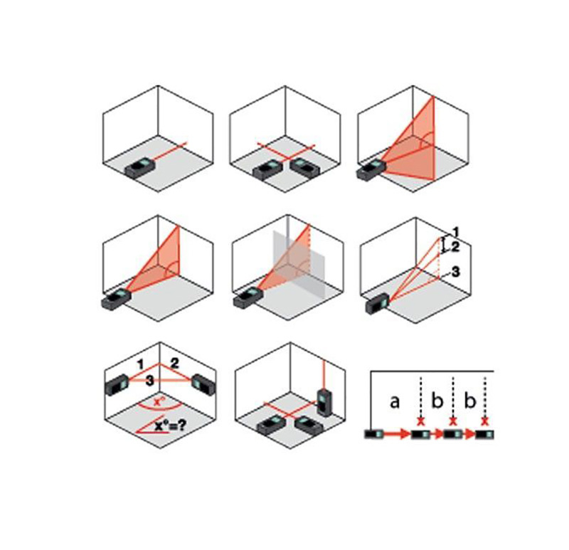 ADA COSMO 100 hat einen eingebauten Neigungsmesser. Diese Funktion wird verwendet, um unzugängliche Werte zu berechnen. Außerdem gibt es einen Modus, um gleiche Entfernungen zu messen.