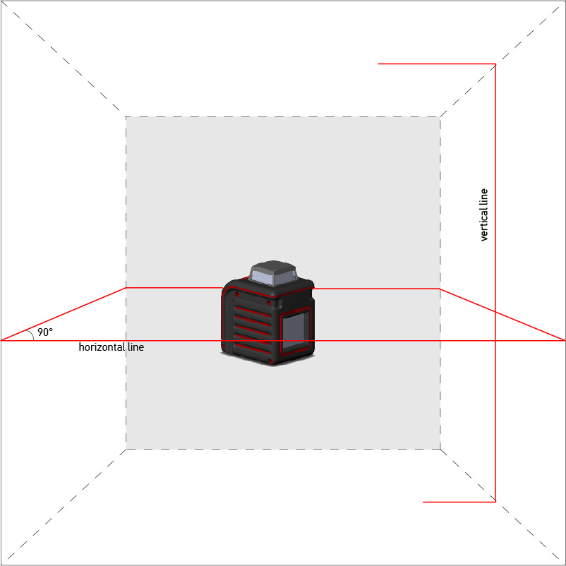 Deze laserlijnen staan tegelijk aan. De twee laserlijnen staan haaks op elkaar. Zo kan gemakkelijk en snel een haakse hoek of een horizontale of verticale referentielijn worden uitgezet.